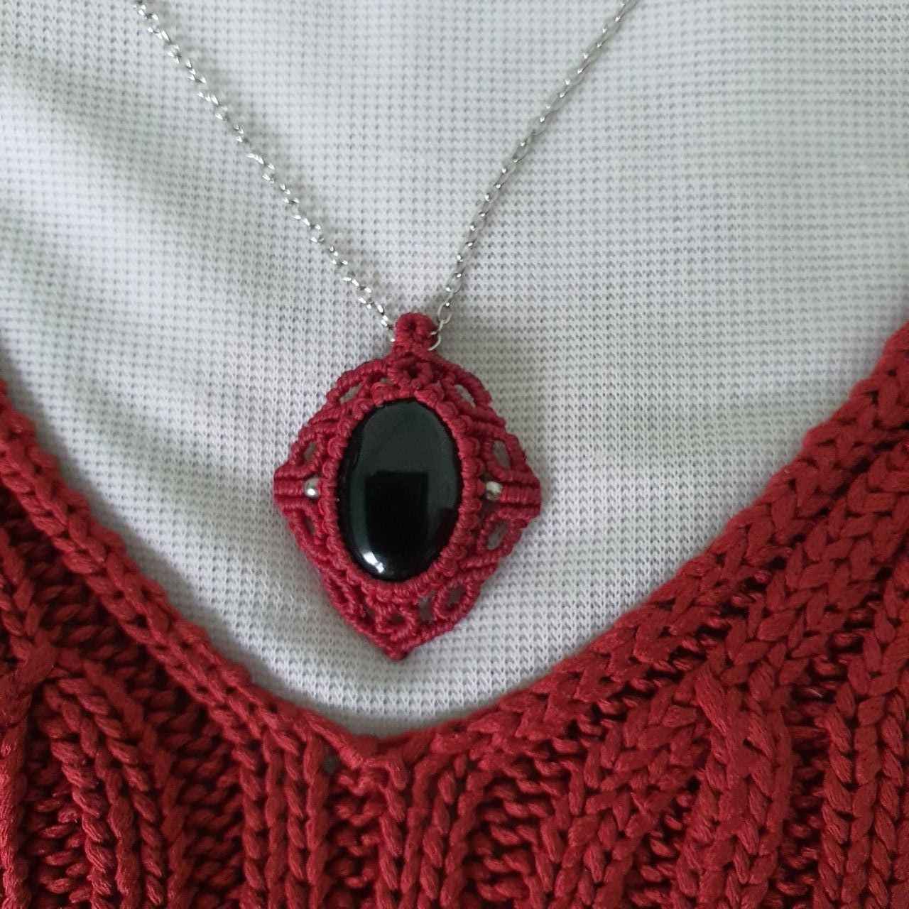 Splendide pendentif ! On dirait qu'il a traversé les époques ! Finement ouvragé en fil couleur lie de vin tout autour d'une agate noire qui devient envoûtante !