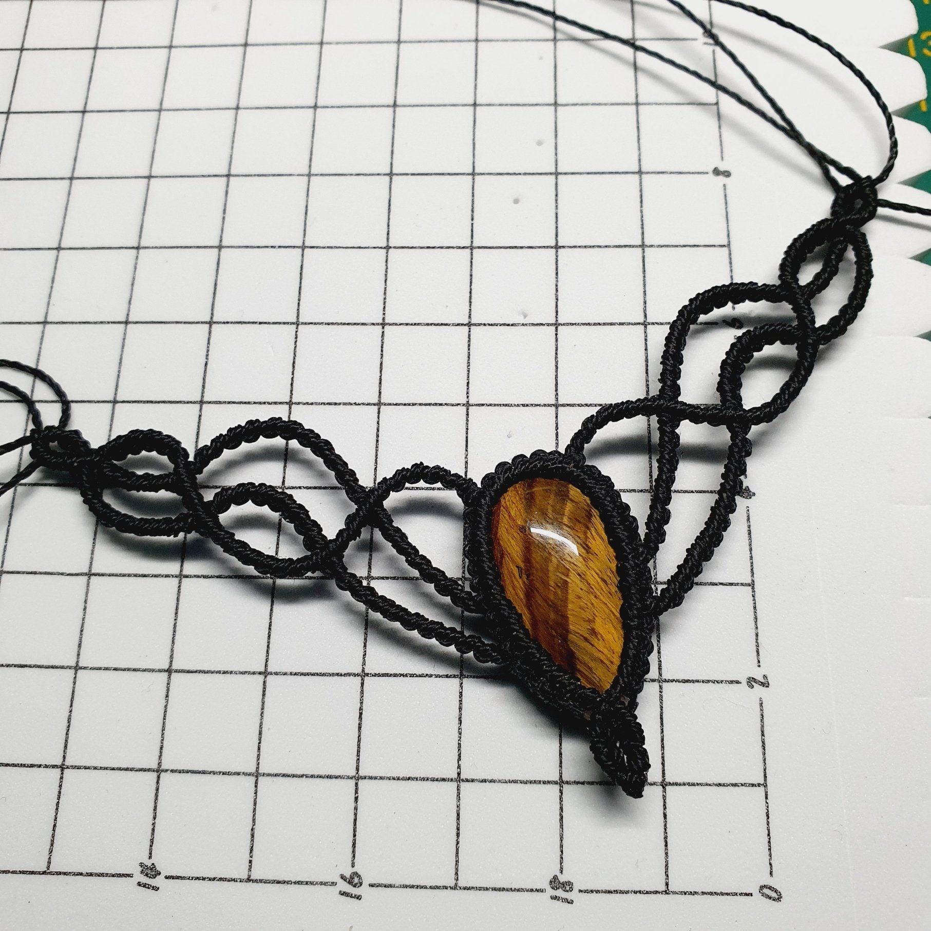 Laissez-vous envoûter par "L'Œil du Tigre Majestueux", une création unique et entièrement artisanale. Ce collier est le fruit d'un travail minutieux de micro-macramé, où chaque nœud est noué avec passion pour former des motifs délicats et entrelacés qui épousent gracieusement votre cou.
