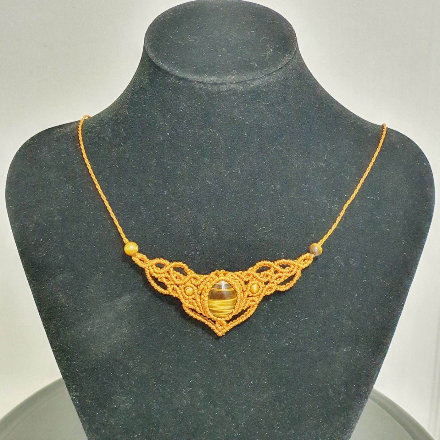 Succombez au charme envoûtant de notre collier "L'Or du Tigre", une pièce artisanale unique qui allie l'élégance bohème à la force protectrice de la nature. Ce collier est méticuleusement noué à la main en macramé, révélant des motifs délicats et une texture chaleureuse.