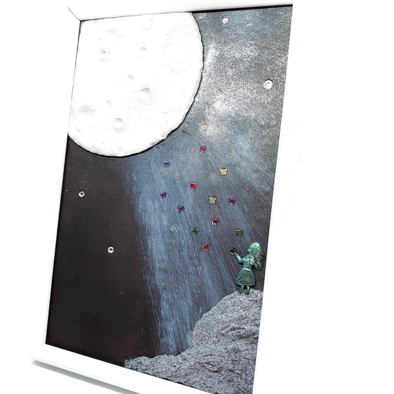 Tableau poétique pour rêveurs éveillés ... où une multitude de papillons multicolores volent sous l'éclairage scintillant de la pleine lune. Tableau réalisé en argile polymère - création unique.